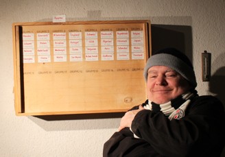 Von links nach rechts sind zu sehen: Der Organisator und nicht zu sehen: der Ziehungsleiter (im roten Pulli), die Losfee, daneben die Auswickelelfe (mit dem Zopf) und hinten in der Ecke FIVA-Präsident Scheik Tibernell (mit der Bierflasche in der Hand).